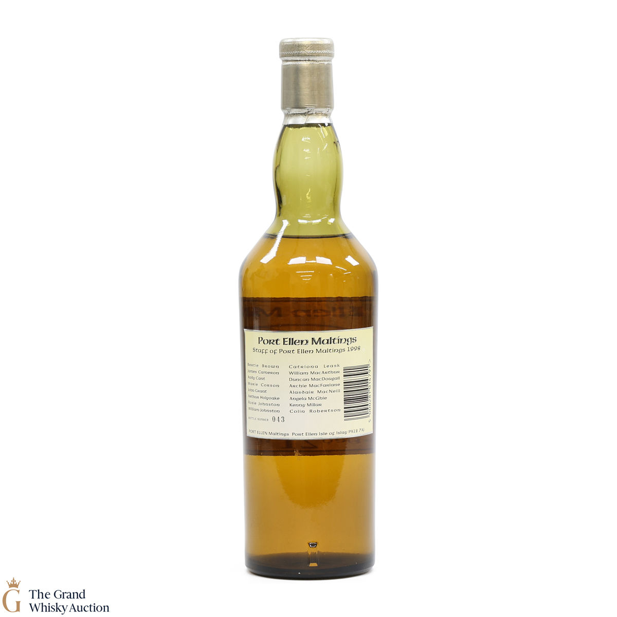 A rare and a stunning Port Ellen, bottled 1998 to commemorate the 25th Anniversary of Port Ellen Maltings. Rear label printed with the names of the distillery staff, 1998.