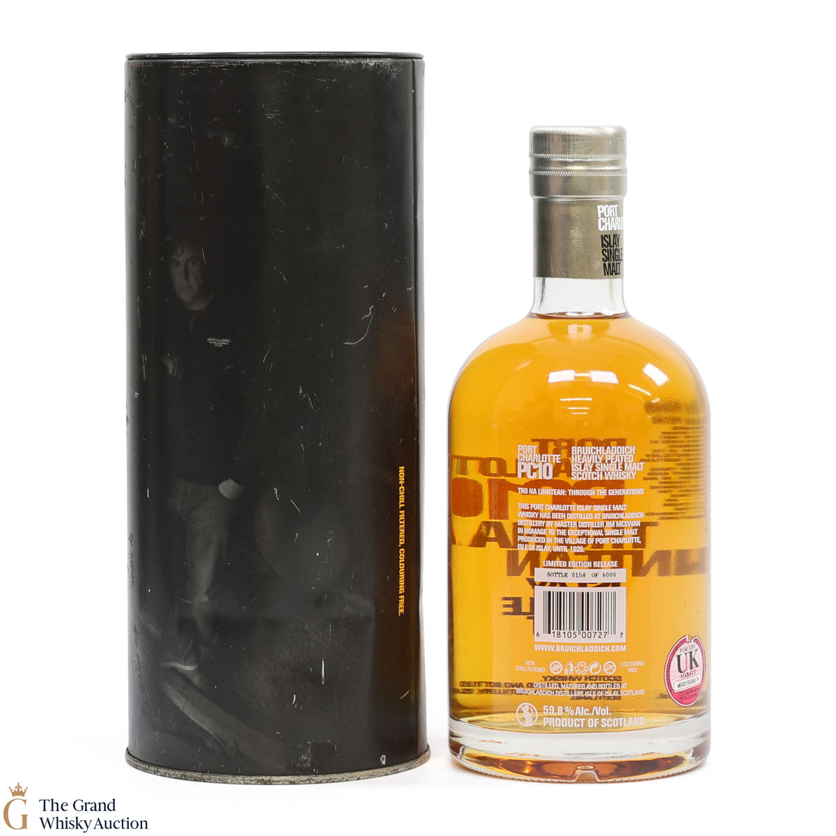 Port Charlotte PC10, produced by Bruichladdich Distillery, is a heavily peated spirit. It was the first release of heavily peated Port Charlotte and was produced in 2001 from some of the first spirits to be produced after the distillery's reopening. The single malt was bottled at 10 years old and was limited to 6000 bottles.