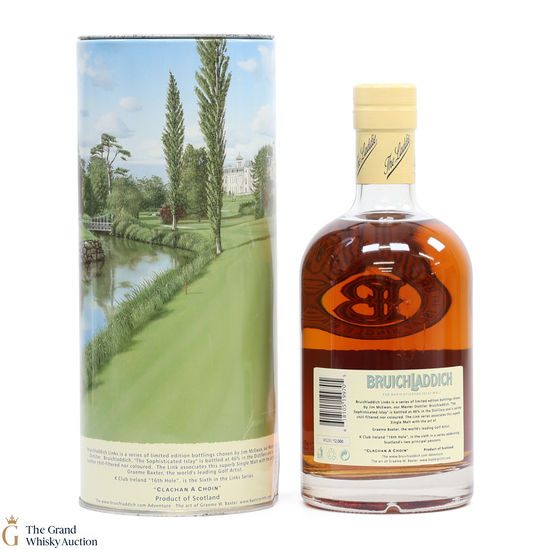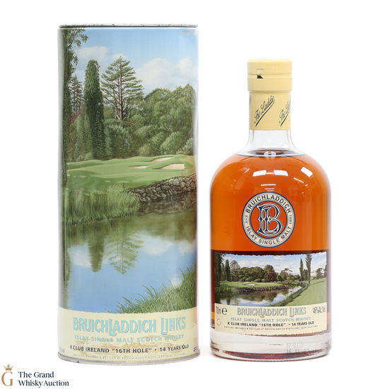 K Club Ireland ''16th Hole'" is the sixth release in the Bruichladdich Links collection. The label and the presentation tube of this 14-year-old single malt depict the art of the very talented Graeme Baxter. This is one of 12,000 individually numbered bottles.