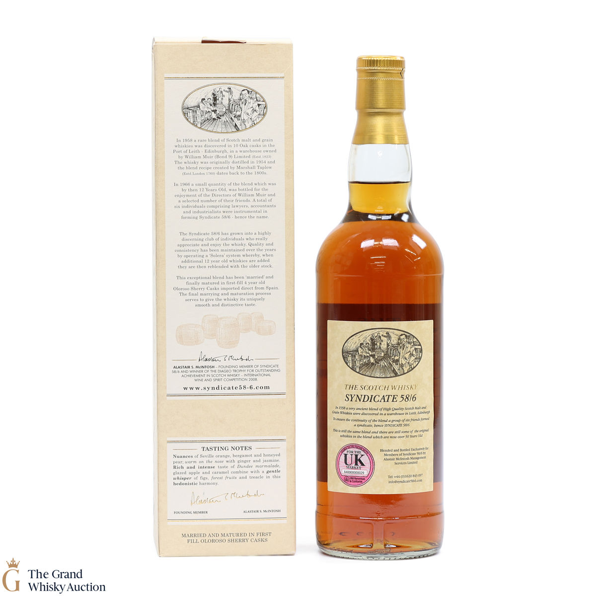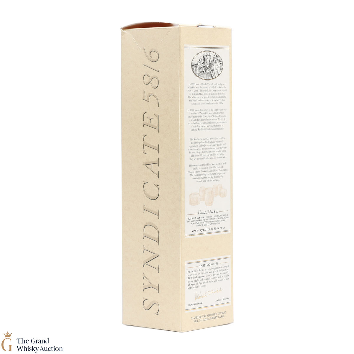 In 1958 a very rare blend of Scotch Malt and Grain Whiskies was discovered, and in 1966 a small quantity of the blend that was now 12 Years Old, was bottled. Six individuals were instrumental in forming what became known as Syndicate 58/6 – hence the name, to ensure the blend lived on.