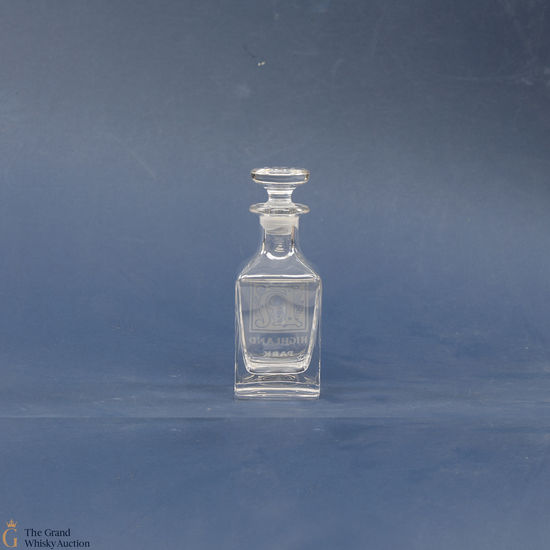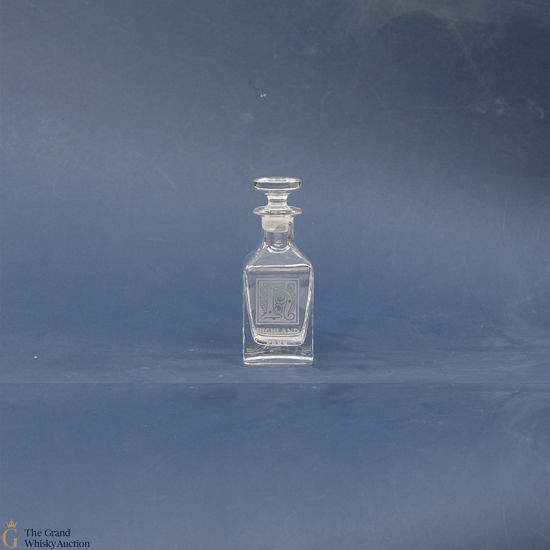 A small glass decanter with an etched Highland Park logo.