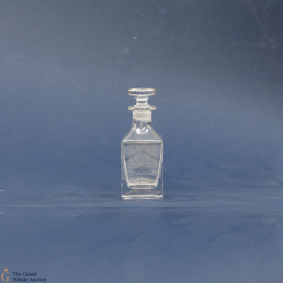 A small glass decanter with an etched Highland Park logo.