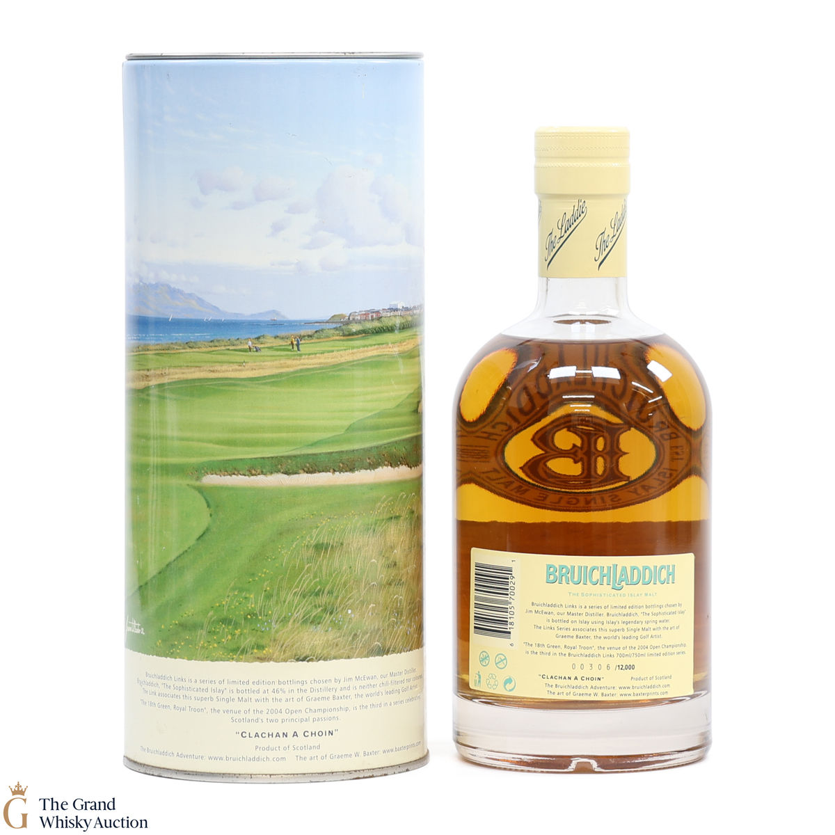 This bottling was the third release in the Bruichladdich Links collection. This 14-year-old single malt depicts Royal Troon, the 18th Green - the venue for the 2004 Open Championship.
