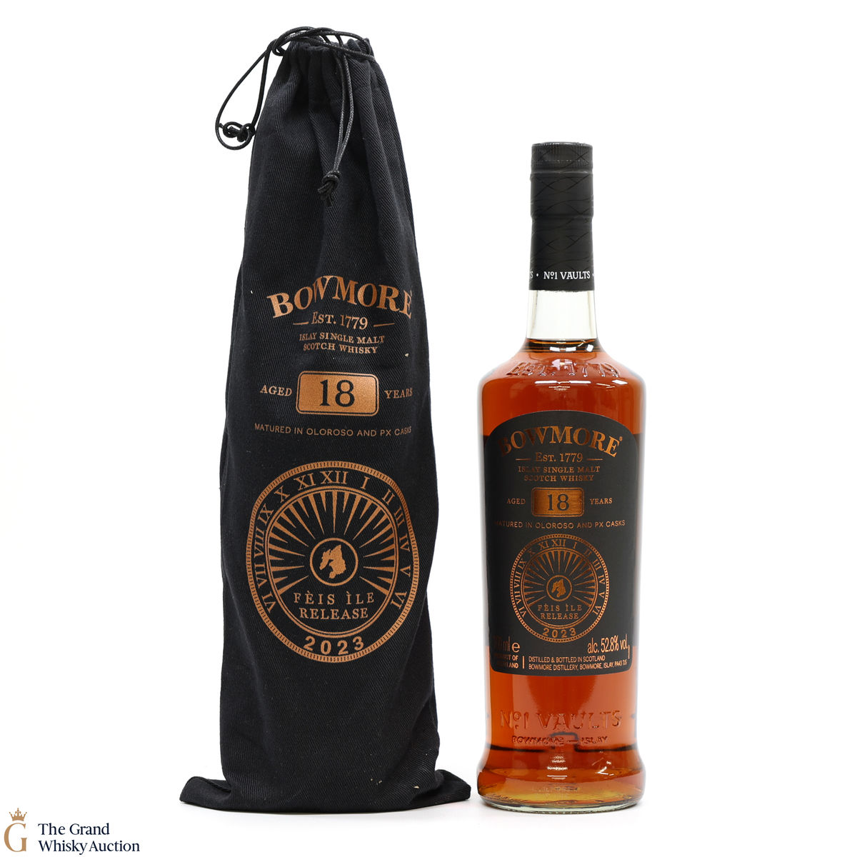 This is the Feis Ile 2023 release from Bowmore Distillery. Matured in Oloroso & PX casks for 18 years, this single malt was bottled at 52.8% ABV. This rare annual release from Bowmore is limited to just 3500 bottles.