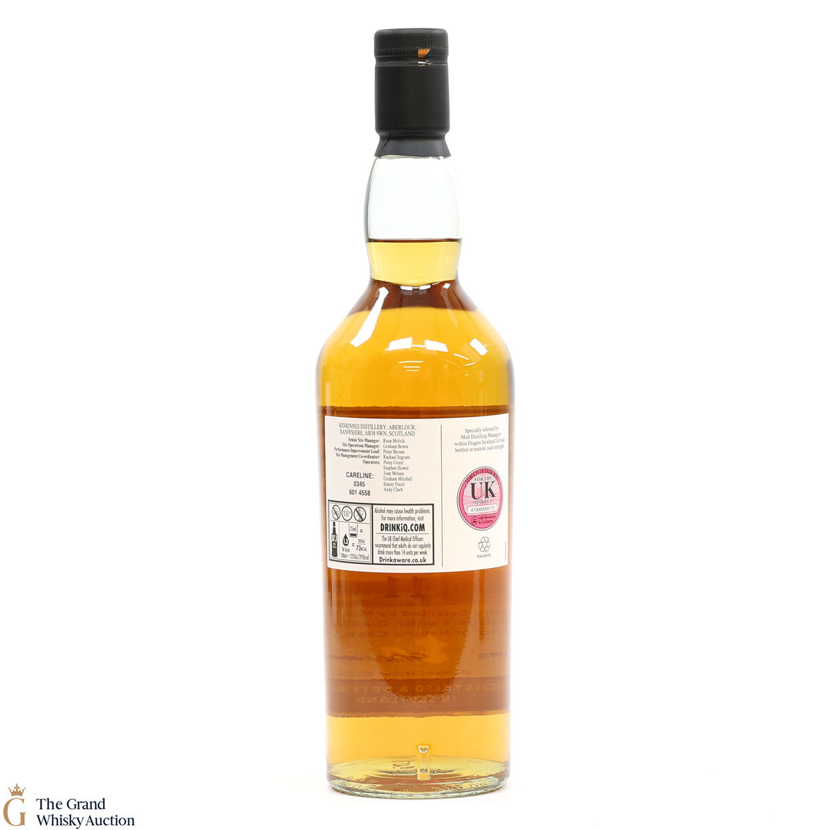 Due to the various ages of bottles and their seals, the condition of liquid is at the buyer's discretion and no claim can be lodged against failure/leakage in transit. Loss and breakage cover is available at 3% of the hammer price as standard. If the lot is not insured, no claim can be lodged against the courier or The Grand Whisky Auction for breakage or loss in transit.
