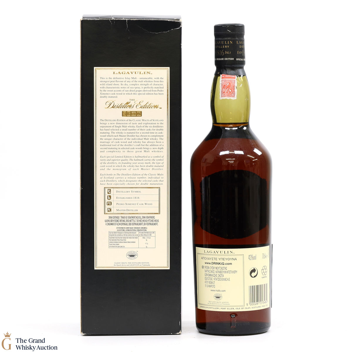 This Lagavulin Distillers Edition was distilled in 1994 before being bottled in 2010. This 16-year-old (ish) single malt whisky of the Classic Malts Selection was matured twice in European Pedro Ximenez Sherry oak casks - these give the whisky more fruity and syrupy character.