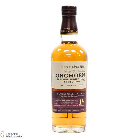 Distilled at Longmorn distillery and was double cask matured in American Oak Barrells and hogsheads for a total of 18 years.