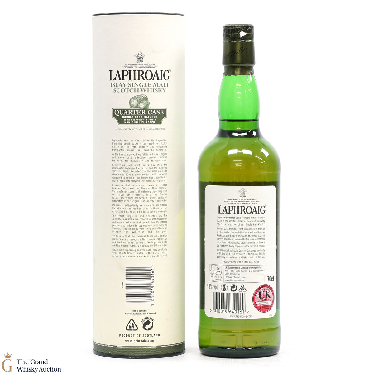 A younger, lively Laphroaig that has had the maturation process speeded up by ageing in quarter casks. As the size of the cask is smaller the maturation doesn't need to be as long. This process has created a soft sweetness and a velvety feel when first tasted, and then the intense peatiness so unique to Laphroaig comes bursting through.