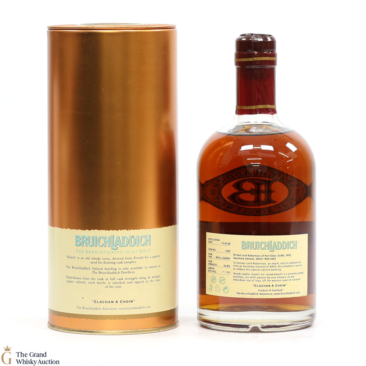 It bears a label that shows Lord Robertson of Port Ellen. This Valinch was matured in refill sherry cask number #1009 and only 390 were produced.