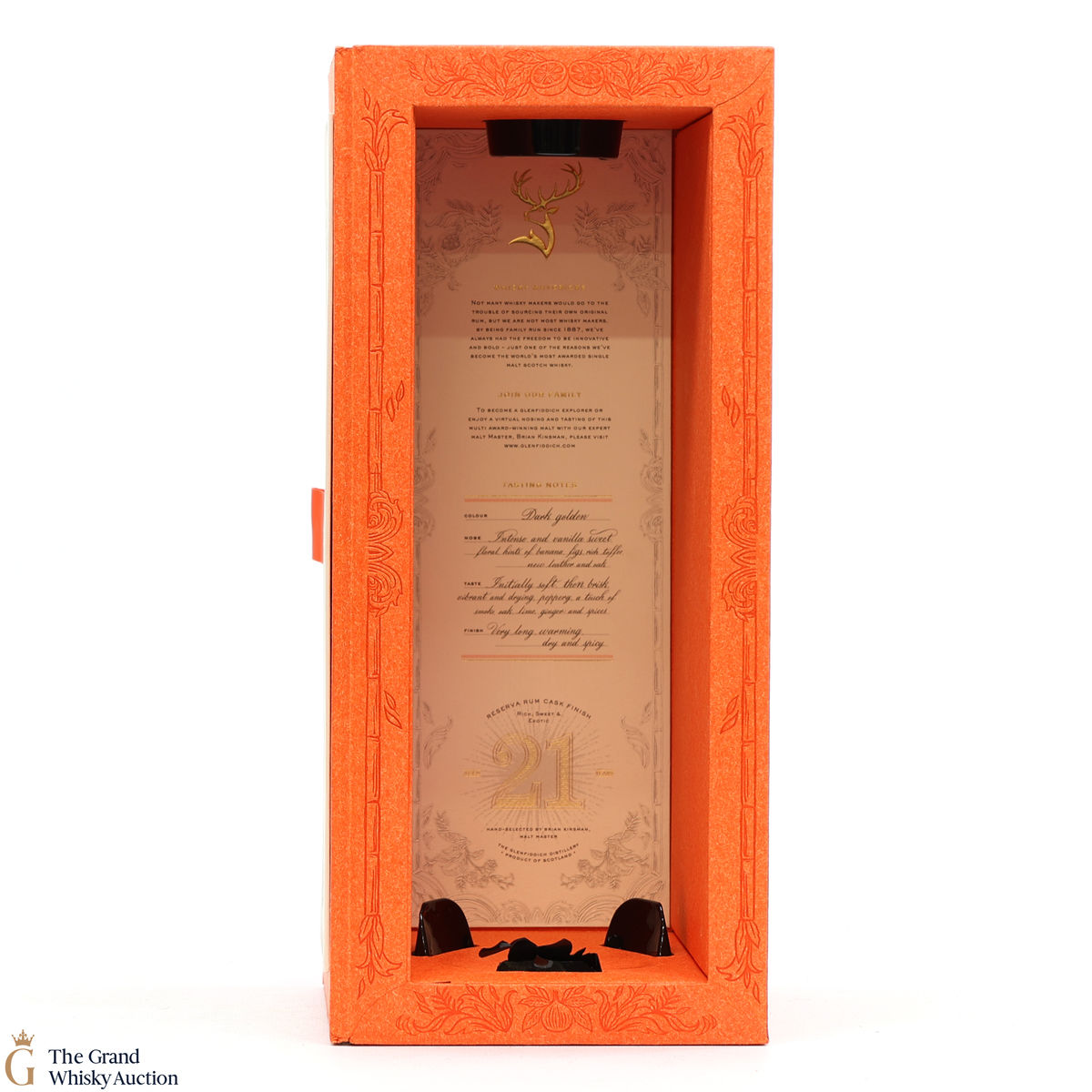 The Glenfiddich Reserva Rum Cask finish has matured and mellowed in American Oak Casks for 21 years before being finished in previously used Caribbean Rum casks. Infused with a spicy warmth and indulgent toffee sweetness, with hints of tobacco.