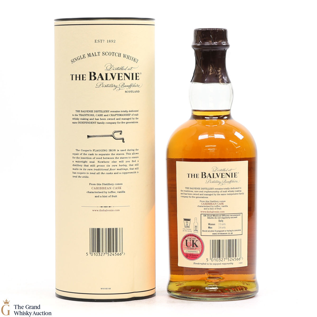 This lot is the famous Balvenie Caribbean Cask 14-year-old single malt whisky.