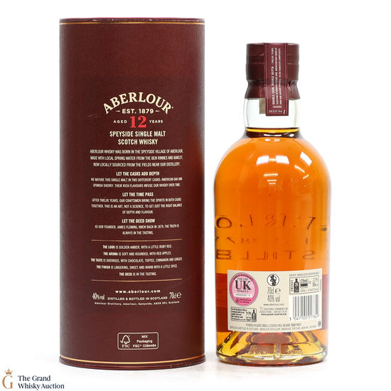 This Aberlour 12 Year Old, has been double cask matured in two handmade oak cask types. The double maturation both traditional oak and sherry casks adds depth of character to this single malt, now bottled at 40% abv.