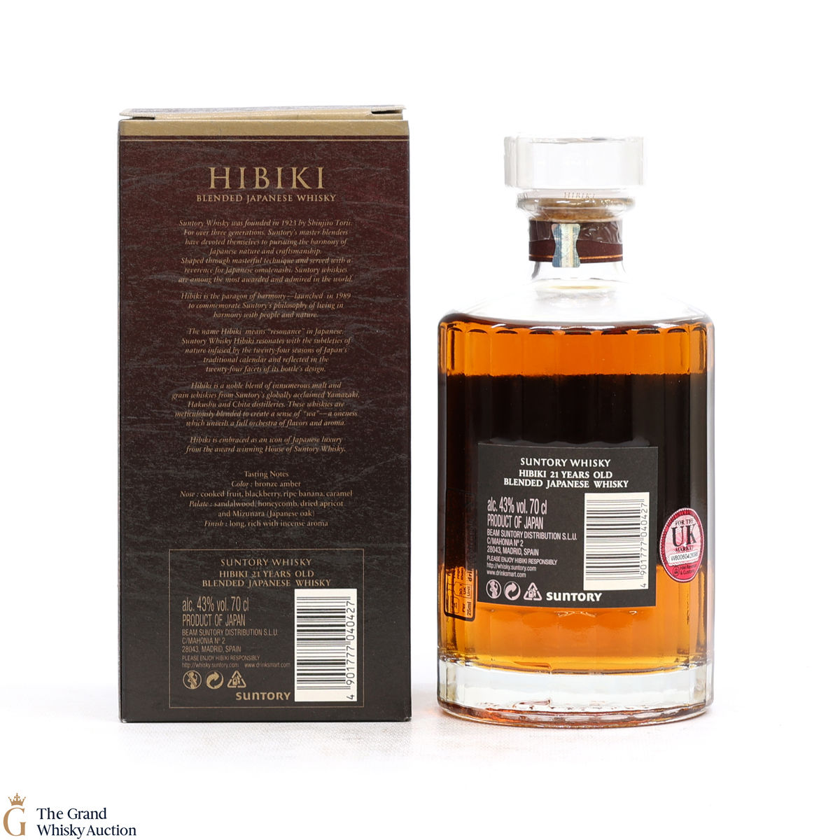Hibiki 21-Year-Old is a very popular blended whisky from Suntory. It is made up of a blend of specially selected mature malt and grain whiskies aged over 21 years. The key Yamazaki sherry casked malt is vatted with other carefully chosen mellow unblended grain whiskies over 21 years old.