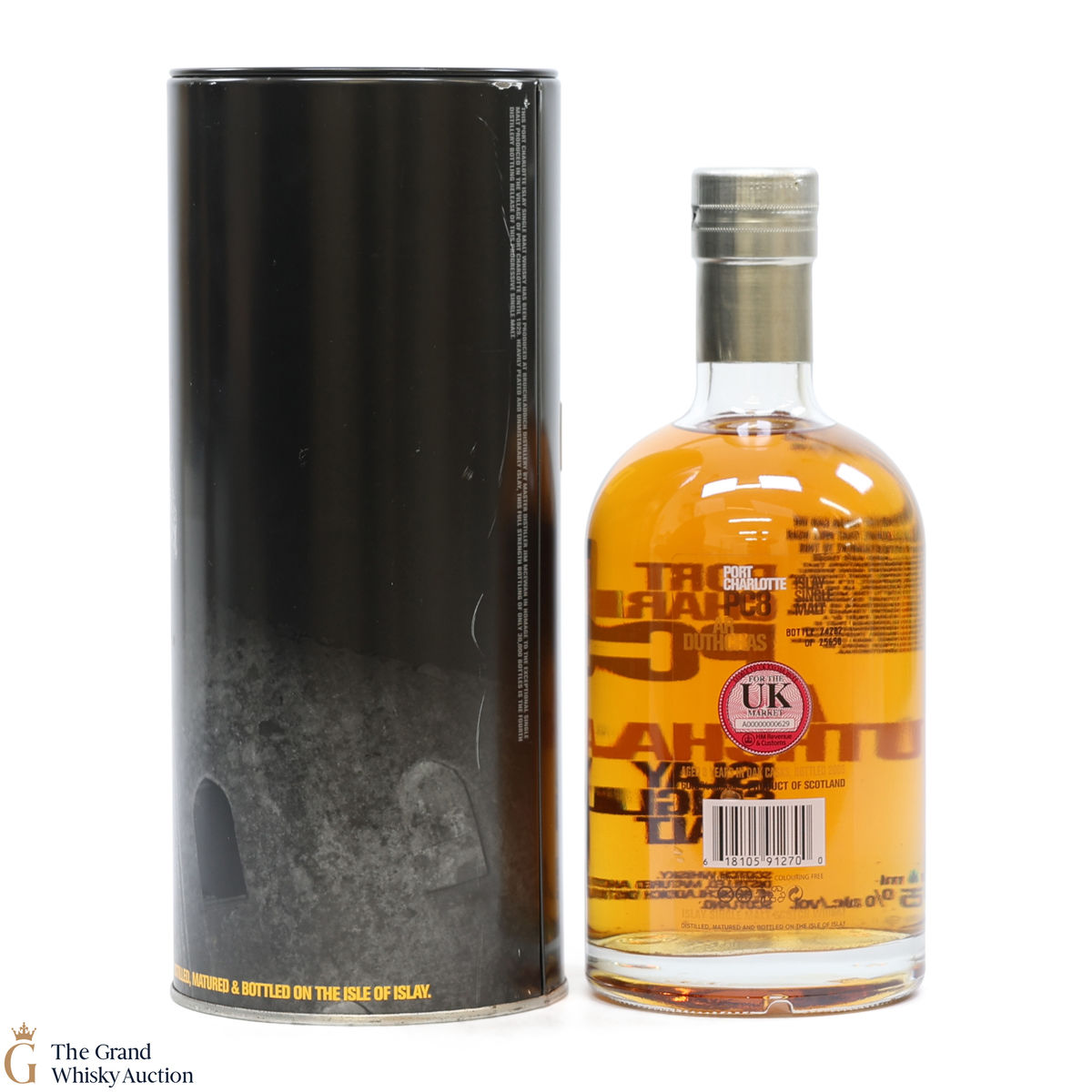 Port Charlotte PC8, produced by Bruichladdich Distillery, is a heavily peated spirit. It was the first release of heavily peated Port Charlotte and was produced in 2009 from some of the first spirits to be produced after the distillery's reopening. The single malt was bottled at 8 years old in 2006 and was limited to 30000 bottles.