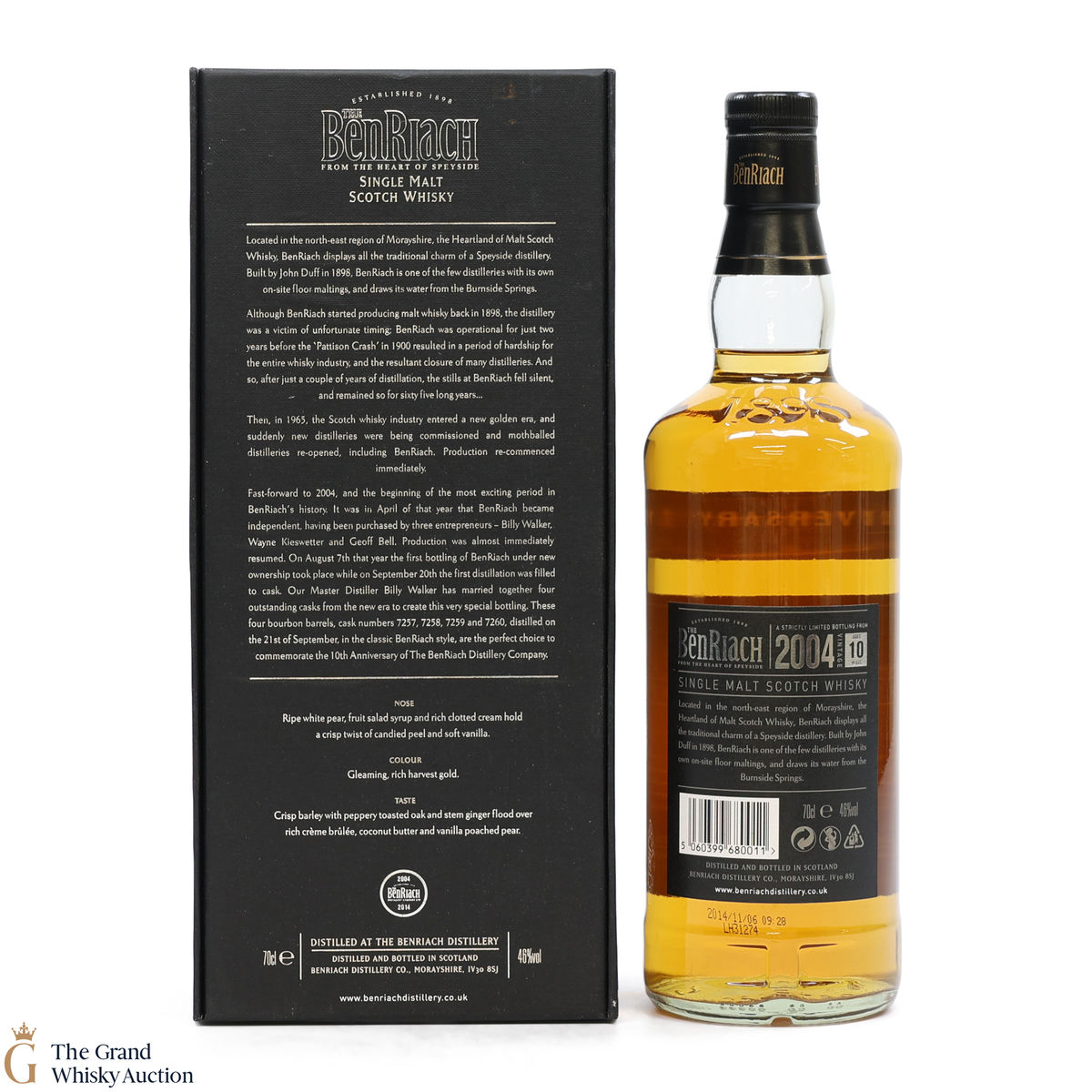 A 10-year-old Benriach to commemorate the 10th anniversary of the reopening of the distillery by Billy Walker. Created exclusively from Benriach distilled during the very first week of production under independent ownership from four ex-bourbon barrels filled on 21 September 2004.