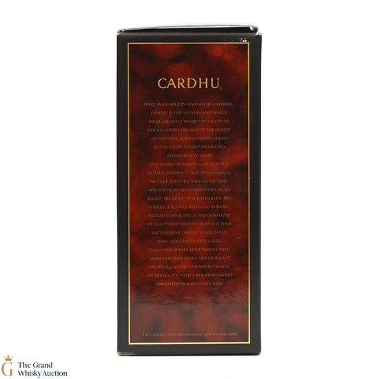 Cardhu 12-year-old single malt whisky from Speyside, Scotland. This single malt was purely produced at the distillery in Morayshire, Scotland. Although recognised as a Speyside whisky, they actually advertise as being Highland Scotch Whisky.