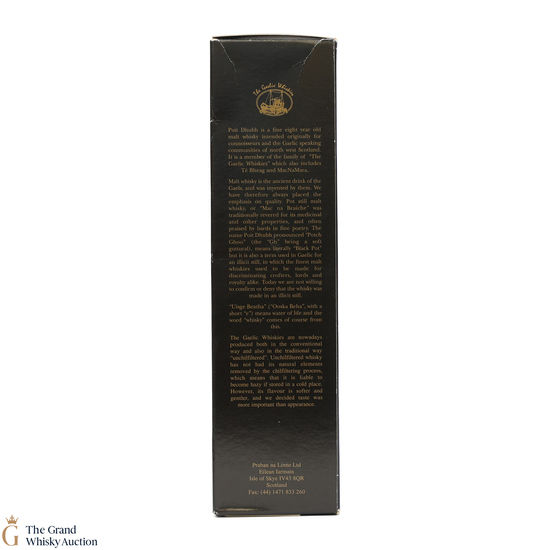 Poit Dhubh (pronounced 'Potch Ghoo') is an 8-year-old black-label malt whisky made in the old-fashioned pre-war, it has not been chill-filtered.