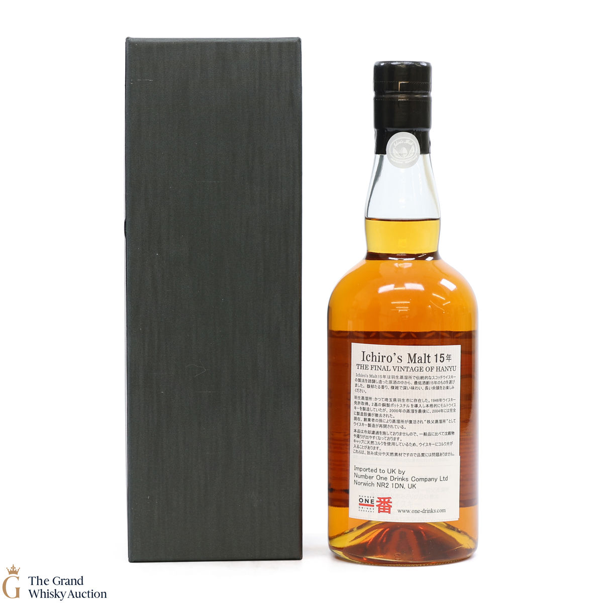 A rare and exciting bottling of 15 year old Hanyu Japanese single malt whisky. It was distilled in 2000, aged for 15 years, and bottled at 46.5% ABV as part of the Ichiro's Malt range from stocks acquired by Ichiro Akuto after Hanyu closed down in 2000.