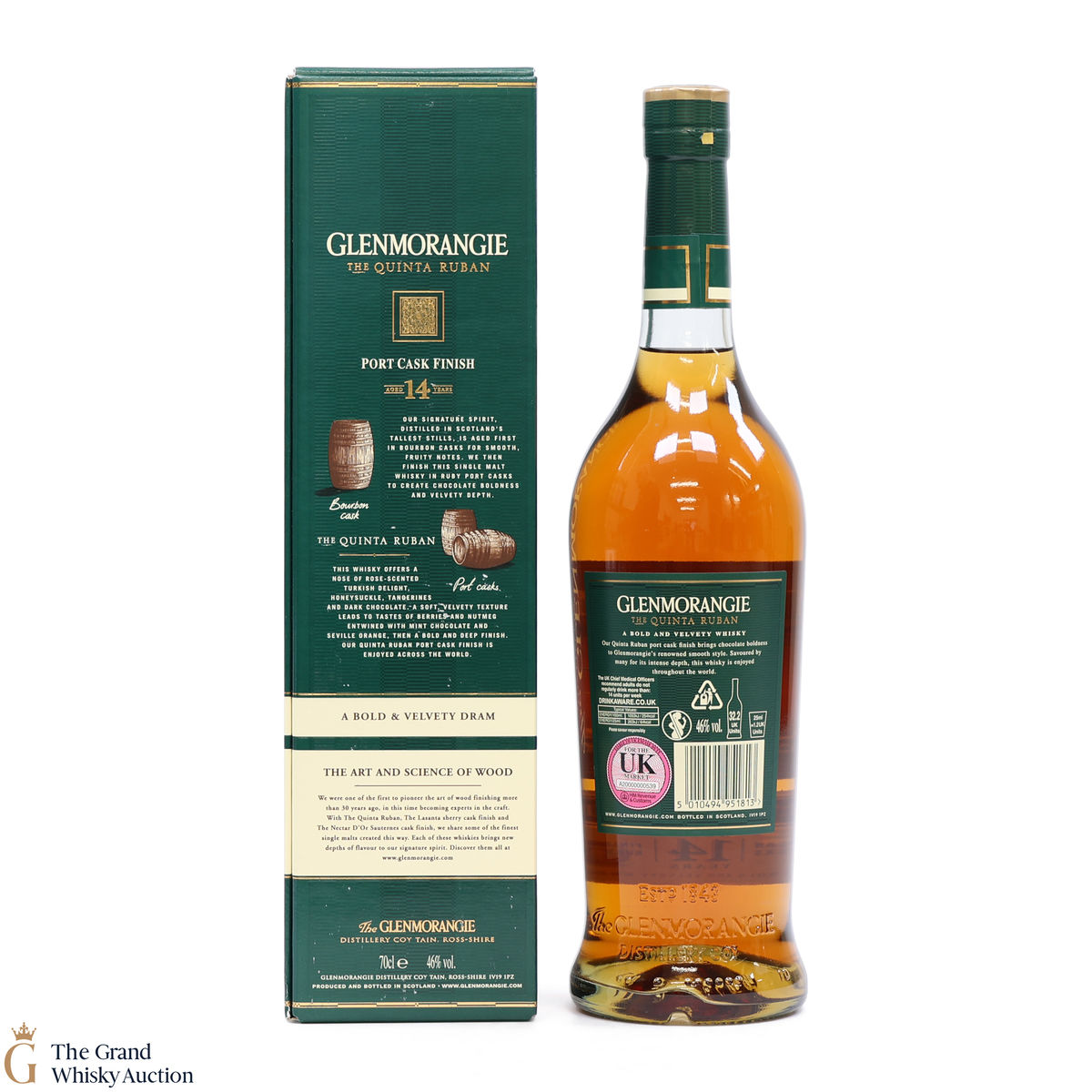 Glenmorangie Quinta Ruban is matured in bourbon casks before finishing in the finest Ruby Port casks from the "Quintas" or wine estates of Portugal. Ruban is Gaelic for Ruby.