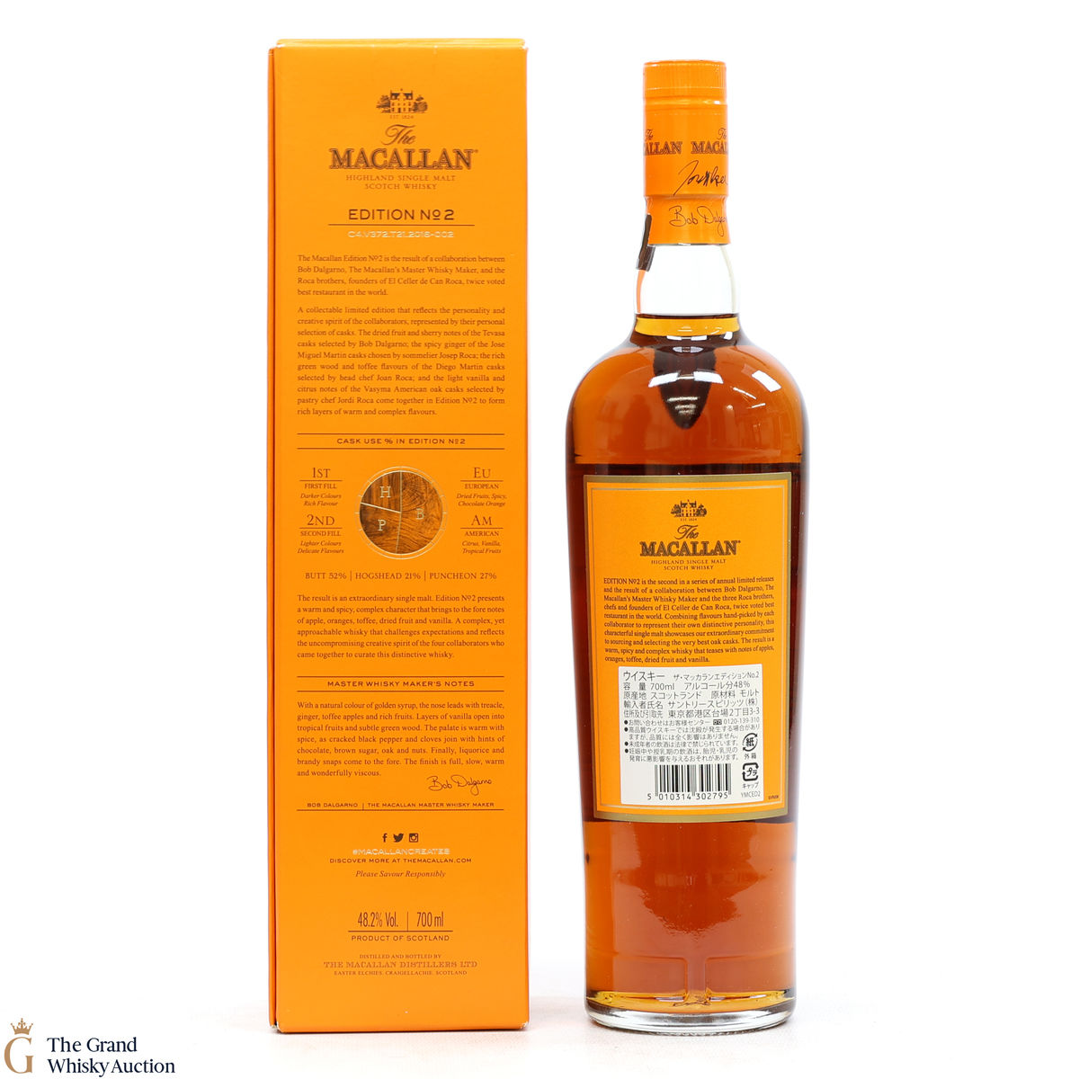 This is the second release from the Macallan Edition series. Edition No.2 is a collaboration between Macallan's master blender Bob Delgarno and legendary Spanish chefs Joan, Josep and Jordi Roca. The Rocas are the three brothers behind El Celler de Can Roca (named Best Restaurant in the World twice by Restaurant magazine). This single malt was drawn from a combination of sherry puncheons, butts and refill hogsheads.