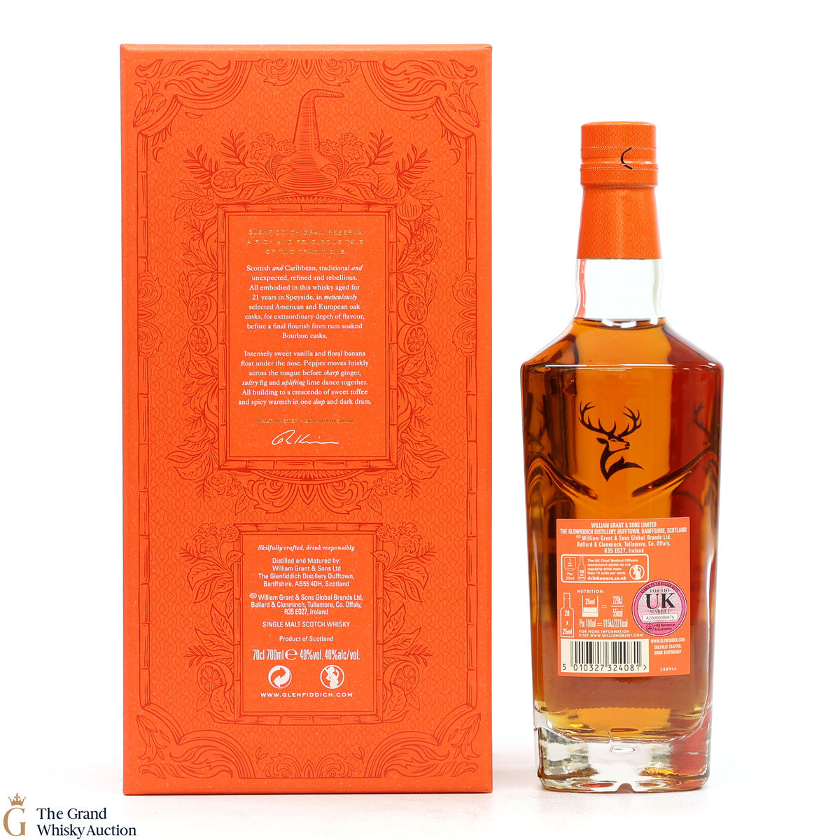 The Glenfiddich Gran Reserva has matured and mellowed in American Oak Casks for 21 years before being finished in previously used Caribbean Rum casks for 4 months.