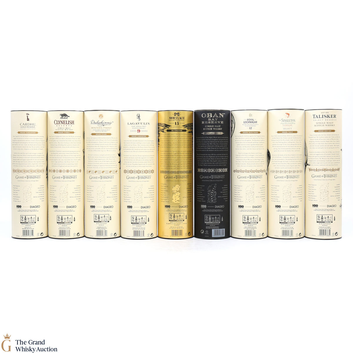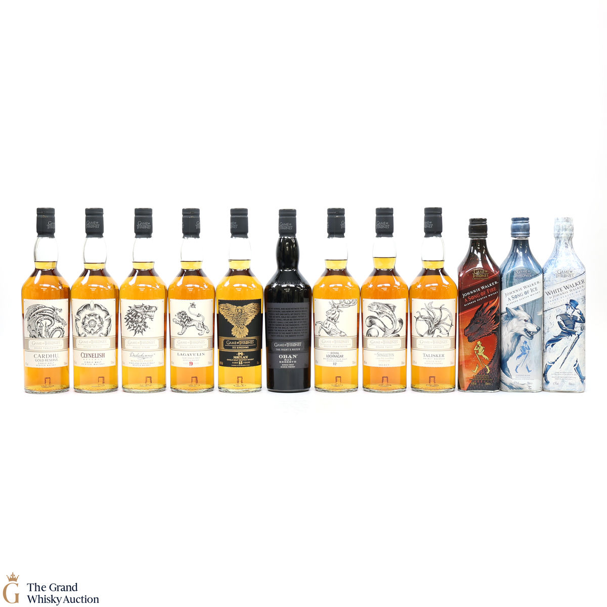 Game of Thrones series plus Johnnie Walker White Walker Game of Thrones edition, Song of Fire and Mortlach, Six Kingdoms edition. This lot includes 12 x 70cl.