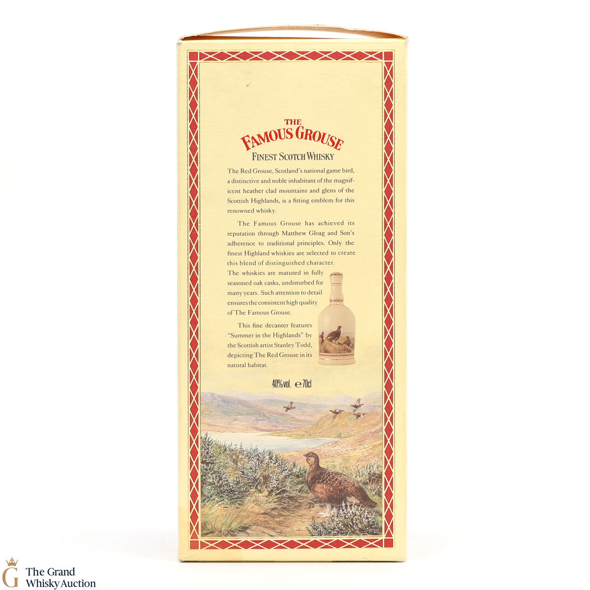 A bottle of Famous Grouse housed within a ceramic 'Highland' decanter. First blended by Matthew Gloag & Son in 1896, as of 2013, it has been the highest-selling brand of whisky in Scotland since 1980.