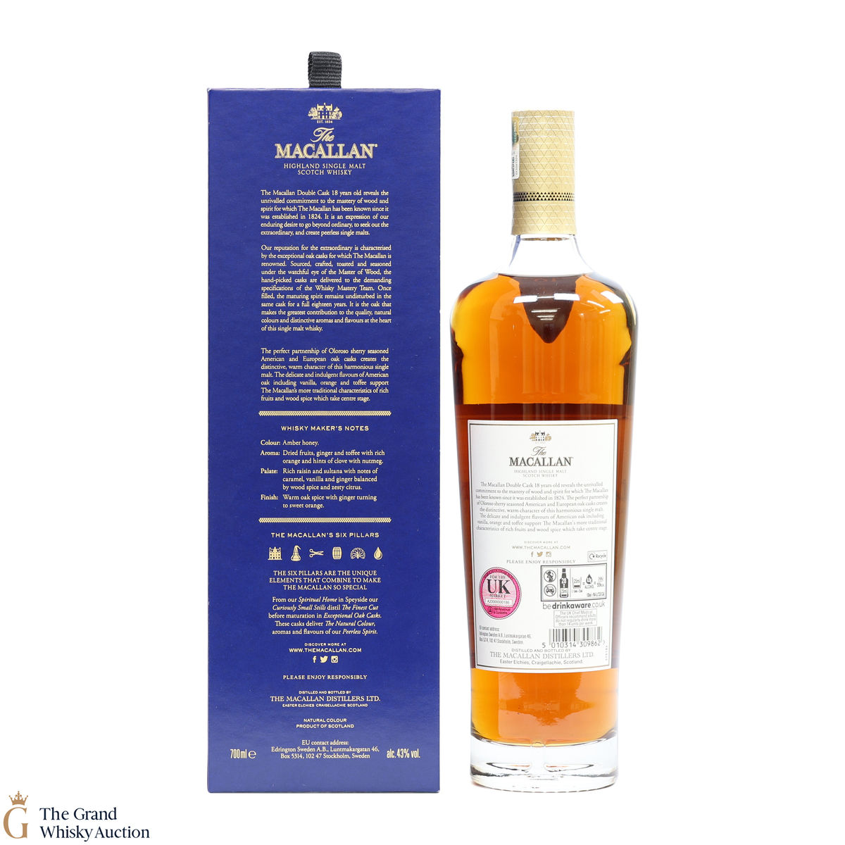 This 18-year-old Macallan was matured in a combination of American and European Sherry oak for a minimum of 18 years. It is part of the Macallan Double Cask range, which marries the classic Macallan style and the sweetness of American oak.