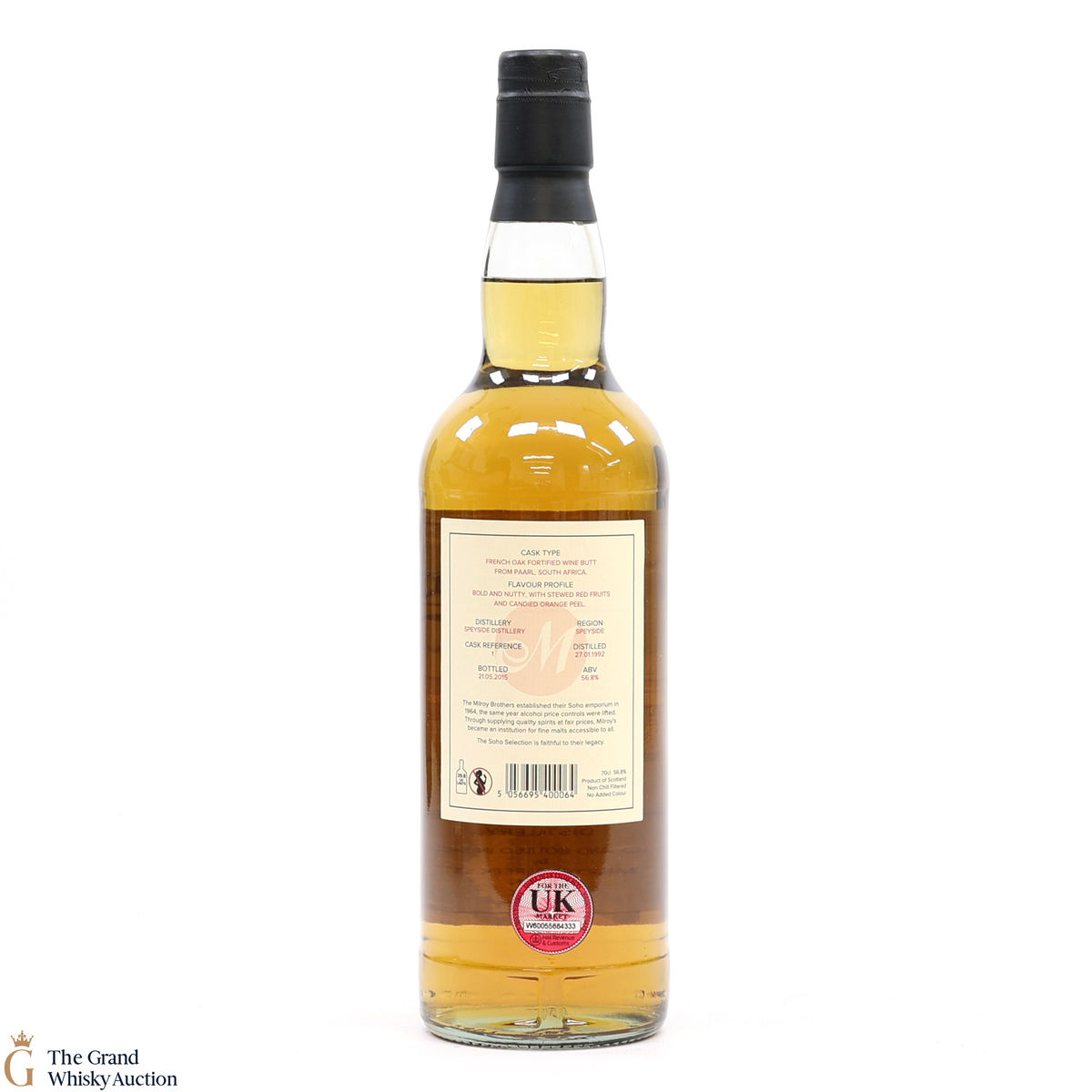 Distilled in 1992 and aged for 23 years this is one of only 300 bottles from Speyside Distillery is part of Milroy's Soho Selection. The liquid was matured in French Oak fortified wine butt from Paarl, South Africa, bottled on the 25th of May 2015 at 56.8% ABV.