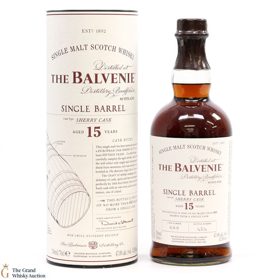 Bottled by hand from Balvenie single sherry cask #609 matured for at least 15 years before being selected by David Stewart, the Balvenie Malt Master. This is one of just 650 bottles drawn from the cask.