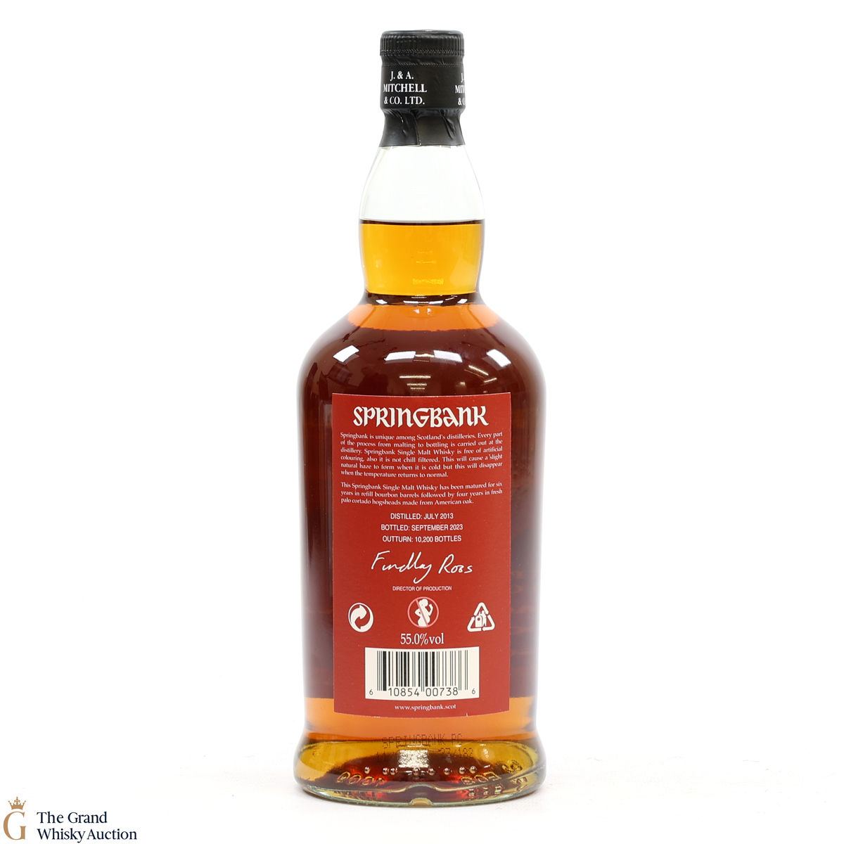 This Springbank Single Malt Whisky was distilled in July 2013 and has been matured for six years in refill bourbon barrels followed by four years in fresh palo cortado hogsheads made from American oak. It was then bottled in September 2023 at a strength of 55% ABV with an outturn of 10,200 bottles.