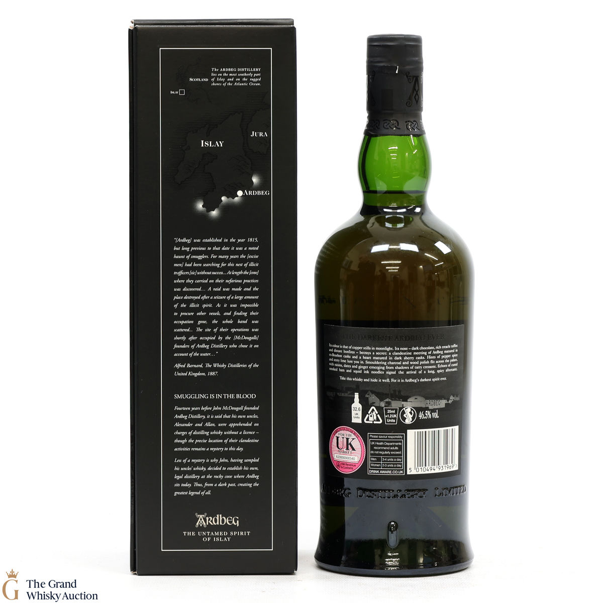The Ardbeg Dark Cove was matured in ex-bourbon and dark Sherry casks to create ‘The Darkest Ardbeg Ever.’ This release, although bottled at a lower ABV than the Committee Release, has garnered great reviews, including one from Dramming.com's Oliver Klimek. It has notes of dark fruits, intense peat, ginger and bacon, with a long smoky finish. It is said to be created to honour the Islay coastline's shadowy past – although the colour isn’t too dark at all, the dark casks used provide plenty of oaky depth.