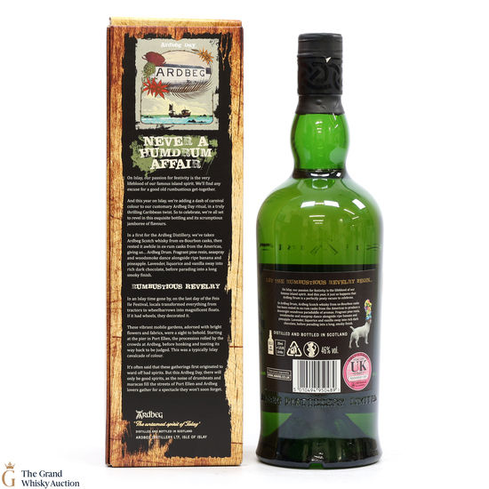 This is the 2019 Ardbeg Drum Limited edition. The Ardbeg Drum is a non-age-statement single malt matured in ex-Bourbon casks and then finished in ex-rum casks from the Americas. It was created to celebrate Ardbeg Day 2019 (June 1) held during the Islay Festival of Music & Malt (Fèis Ìle).