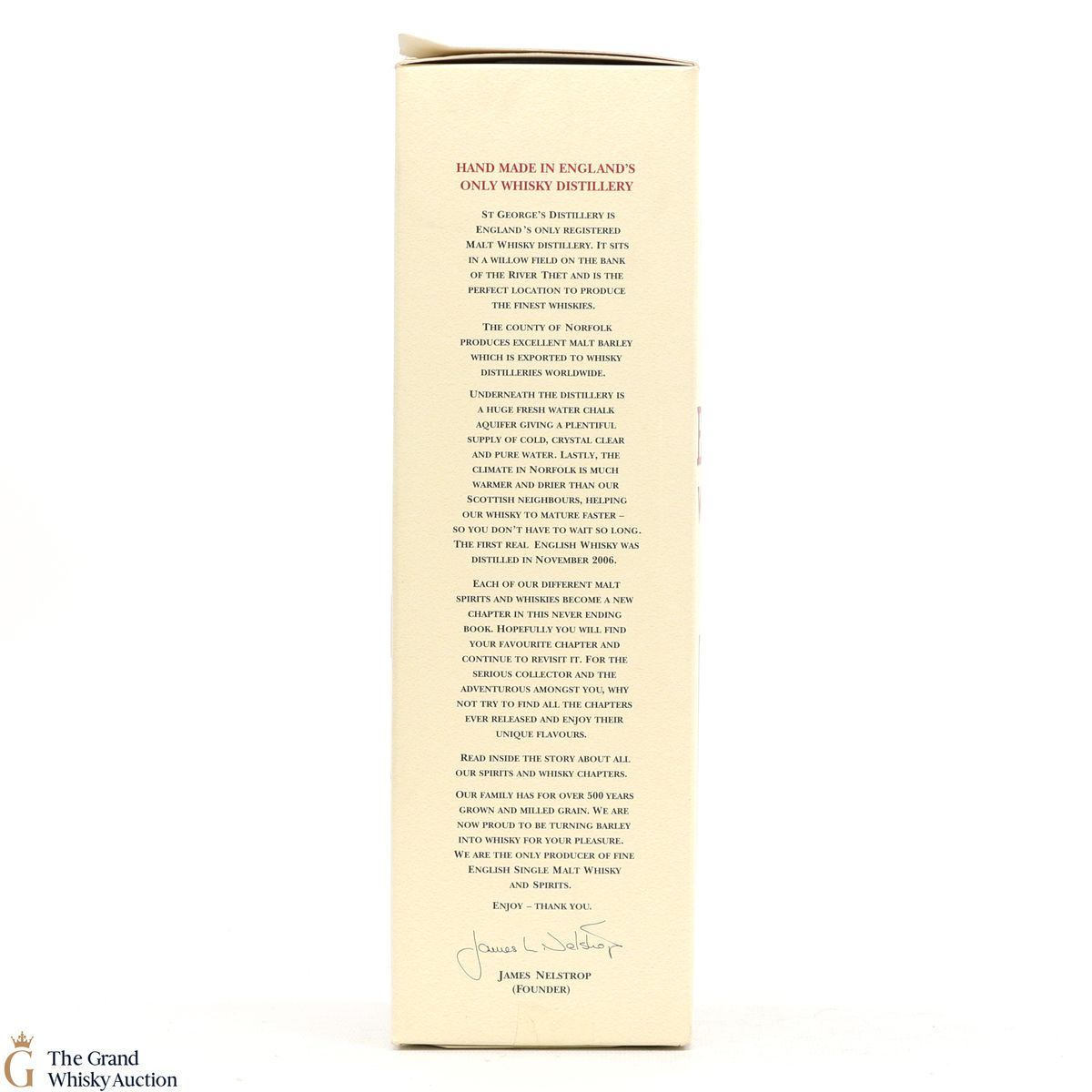 A peated malt spirit from England's only distillery, the Norfolk-based St George's. Matured for a minimum of 3 years and bottled at natural colour from casks 103, 106, 109 & 128.