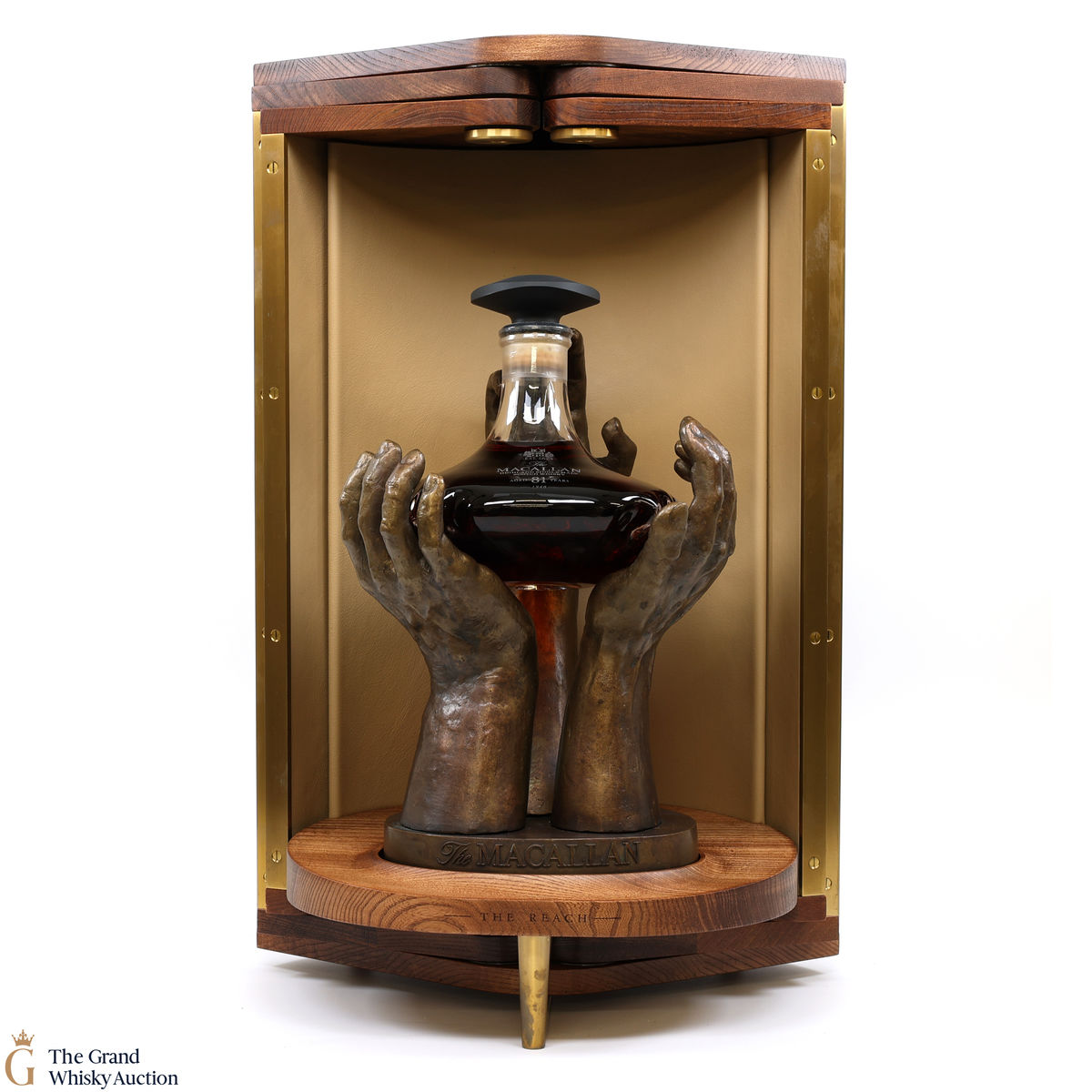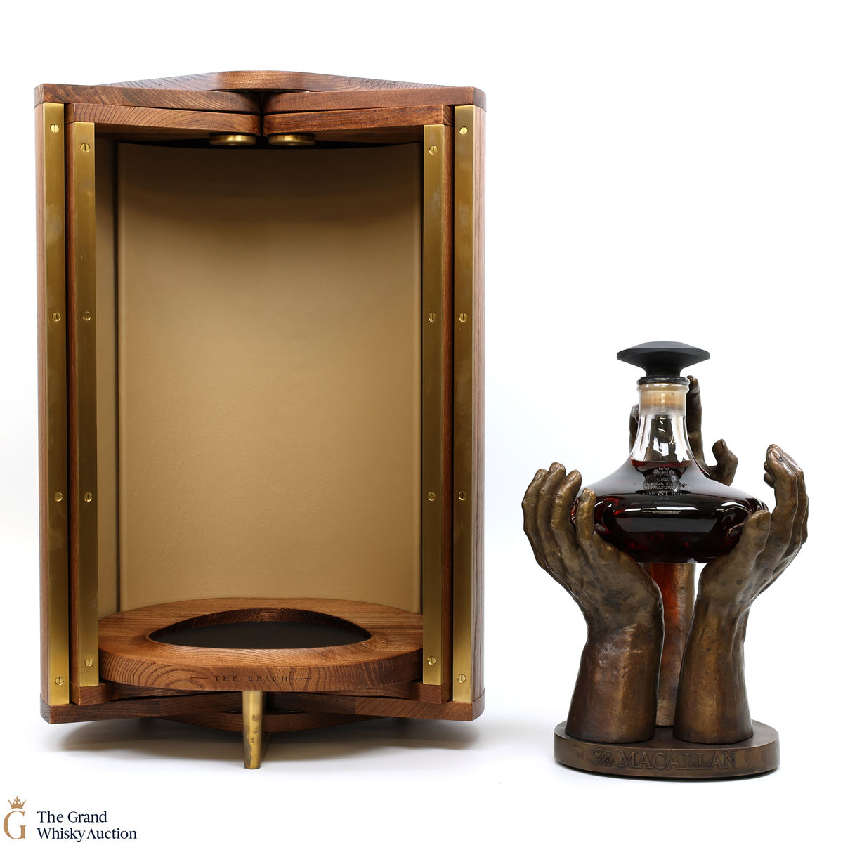 The Reach is presented in unique packaging brought together by a collective of skilled artisans. Encapsulating the theme of collaboration, each detail has been meticulously thought through and represents the work of many hands that brought this whisky to life. Sculptor Saskia Robinson created three hands to cradle the mouth-blown glass decanter, indented with subtle fingerprints that match the hands holding it. The decanter and sculptor are housed in a well-crafted cabinet made with wood from a fallen elm tree. This tree is thought to have been on the Macallan Estate in 1940. A beautifully presented book which details the release is also included.