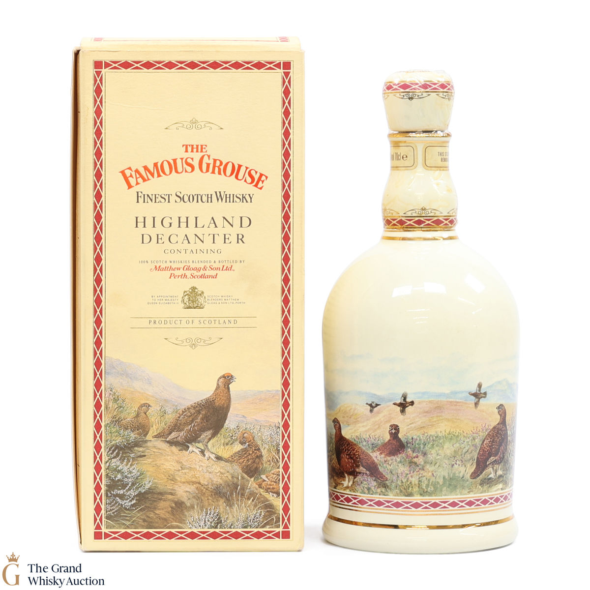 A bottle of Famous Grouse housed within a ceramic 'Highland' decanter. First blended by Matthew Gloag & Son in 1896, as of 2013, it has been the highest-selling brand of whisky in Scotland since 1980.