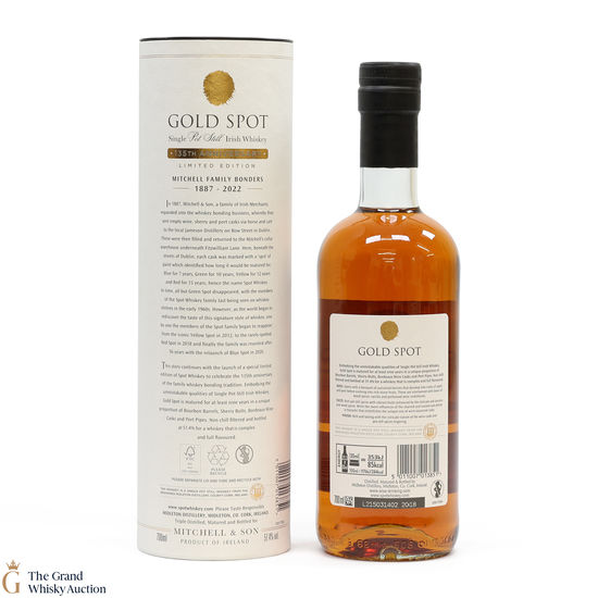Matured for at least nine years in bourbon barrels, Sherry butts, Bordeaux wine casks, and Port pipes. Gold Spot is non-chill-filtered and bottled at 51.4% ABV.
