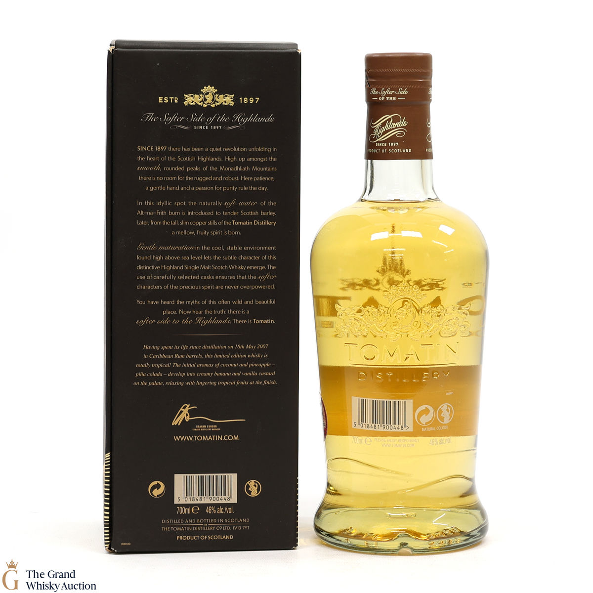 A tropical single malt from Tomatin: "Having spent its life since distillation on 18th May 2007 in Caribbean Rum barrels, this limited-edition whisky is totally tropical!"
