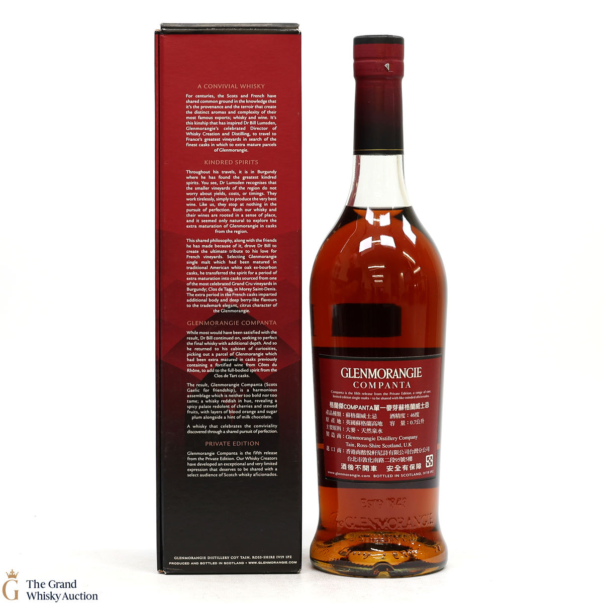 After first maturing in American white oak ex-bourbon barrels, the Companta was matured in 60% Burgundy wine casks from Clos de Tart and 40% Rhône Valley casks that previously held Rasteau, sourced by Glenmorangie's Director of Distilling, Dr. Bill Lumsden.