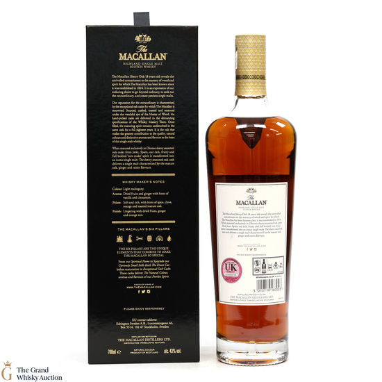 This annual release of The Macallan's popular 18 Year Old Sherry Oak is matured exclusively in sherry seasoned casks, built from both Spanish and American oak, providing a beautifully dark flavour with rich aromas.