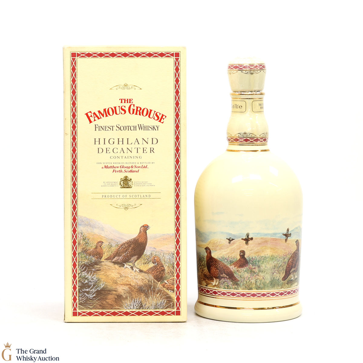 A bottle of Famous Grouse housed within a ceramic 'Highland' decanter. First blended by Matthew Gloag & Son in 1896, as of 2013, it has been the highest-selling brand of whisky in Scotland since 1980.