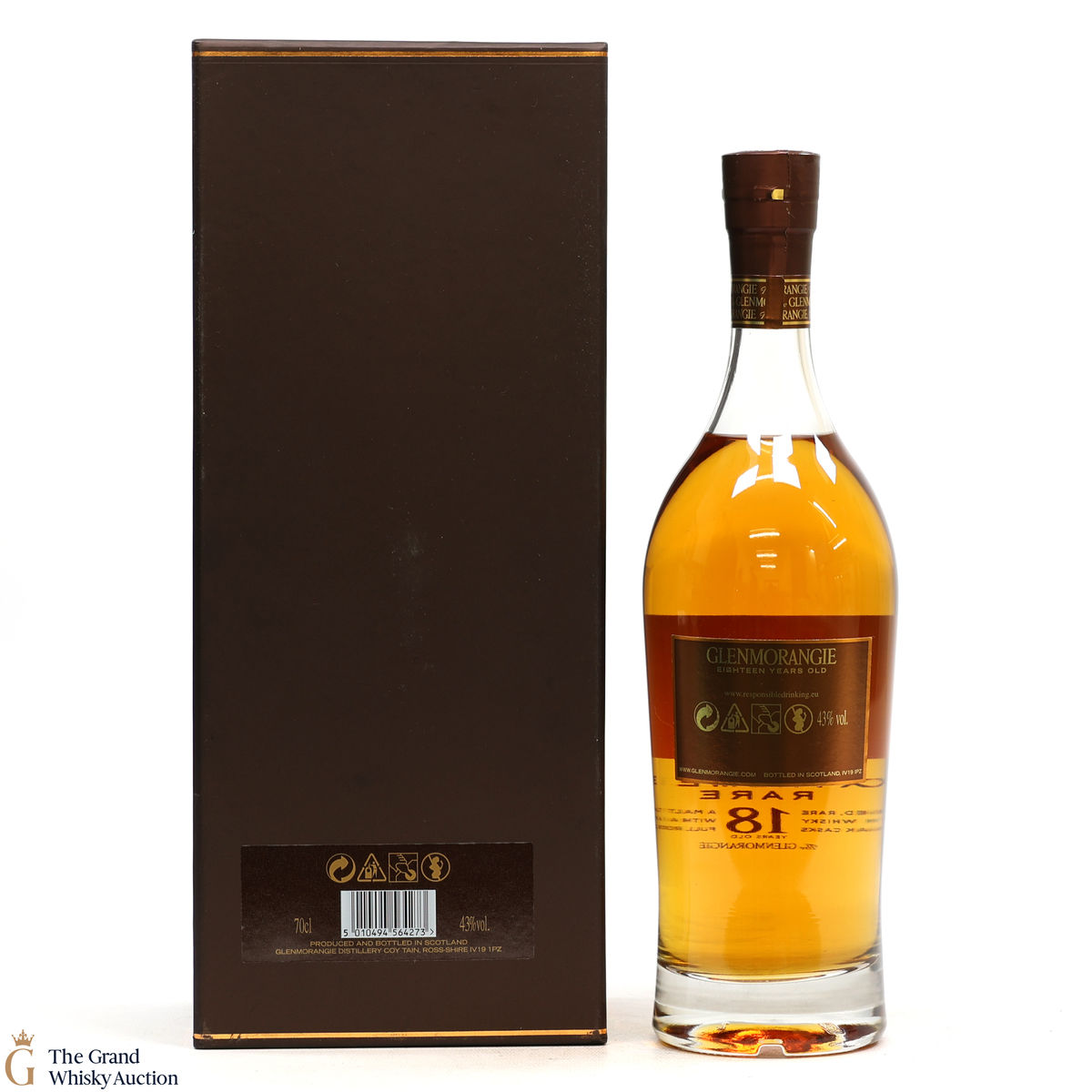 This bottle is an 18-year-old Extremely Rare, Highland single malt produced by Glenmorangie. It has been perfected by the sixteen men of Tain who have specially aged this bottle for 18 years in superior oak casks.