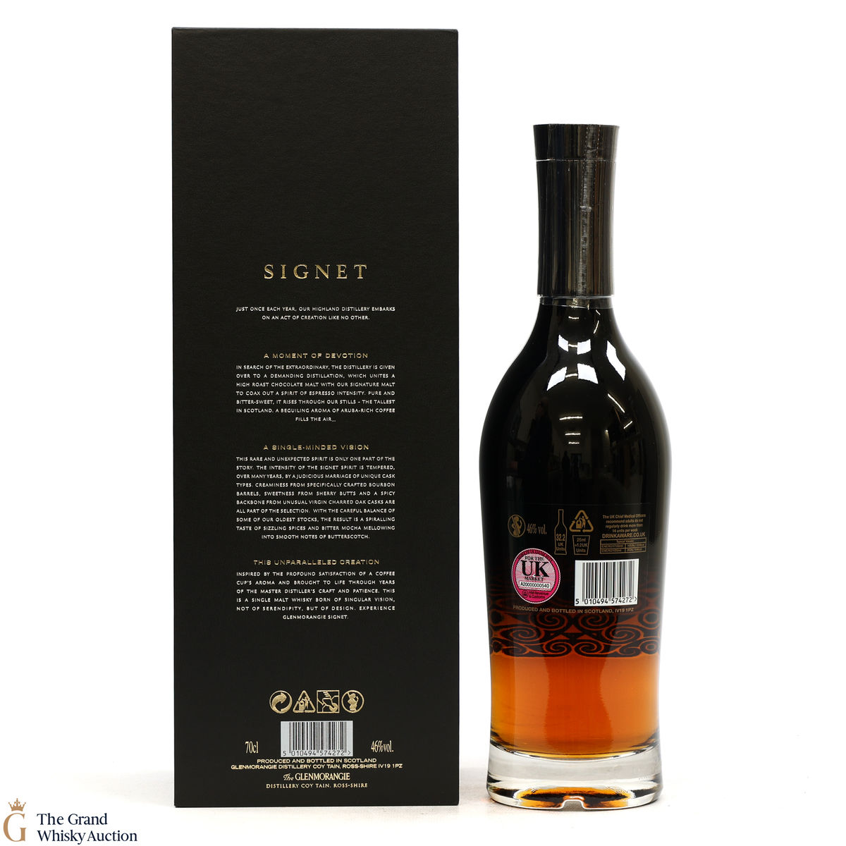 The Signet whisky was crafted using two types of malted barley, a single estate Cadboll variety, and a chocolate barley. Distilled twice through Glenmorangie's copper-pot stills and matured in American virgin oak casks before being bottled at 46% ABV.