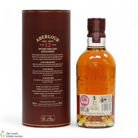 This Aberlour 12 Year Old, has been double cask matured in two handmade oak cask types. The double maturation of both traditional oak and sherry casks adds depth of character to this single malt, now bottled at 40% abv.