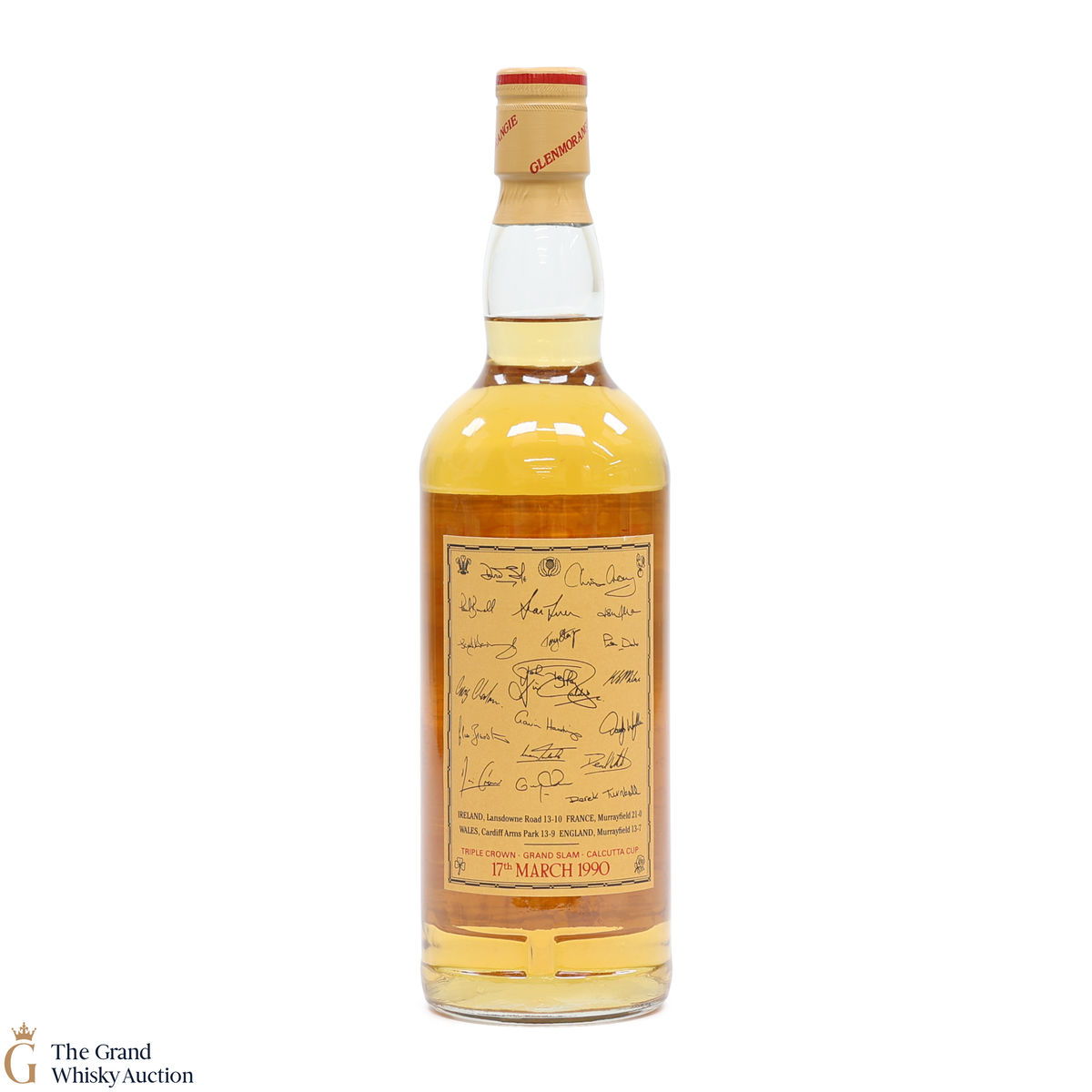 This bottle of Glenmorangie 10-Year-Old was released in celebration of the Scottish Rugby Team's Grand Slam win in 1990 - the victory took place on 17th March 1990 and this is detailed on the neck label.
