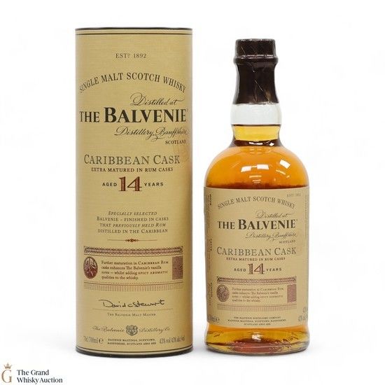 This lot is the famous Balvenie Caribbean Cask 14-year-old single malt whisky.