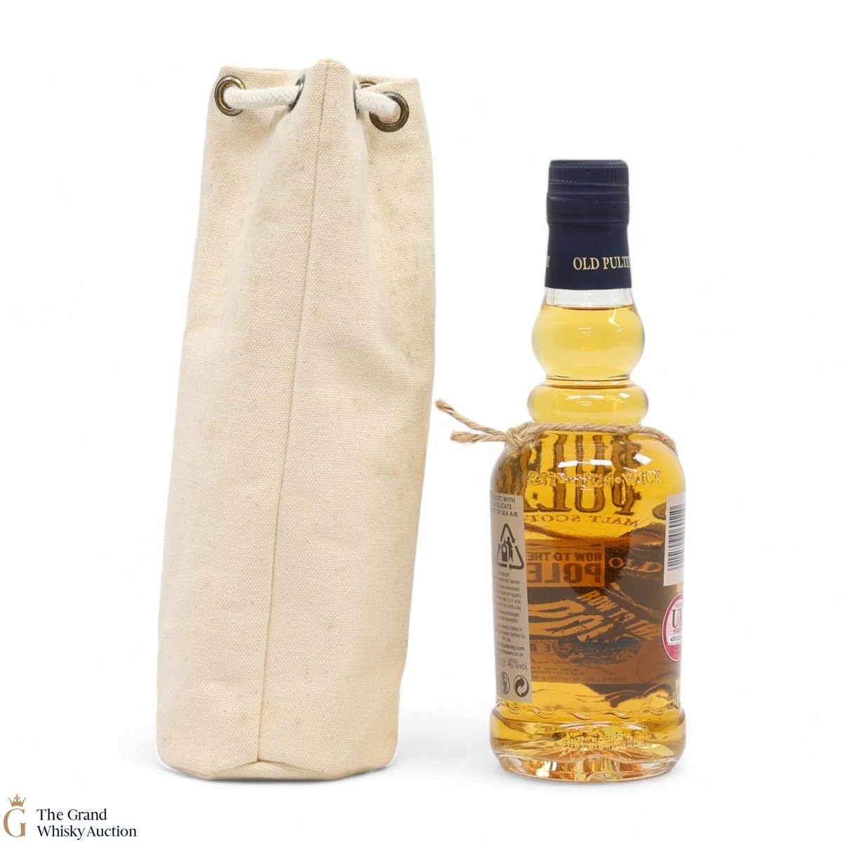 This is a traditional Pulteney dram, with sea air and citrus, packaged in a small sailcloth bag, perfect for hiding away a half bottle when on a small boat.