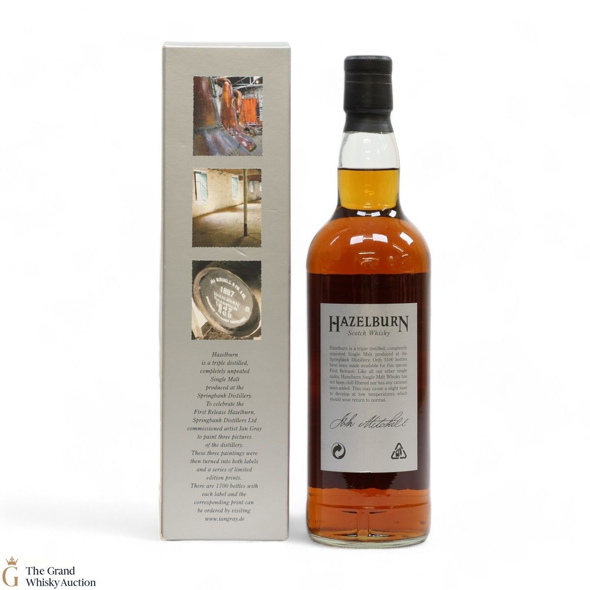 This lot has an 8 year bottle of Hazelburn which is a triple distilled, completley unpeated single malt produced at Campeltown's Springbank Distillery. To celebrate the First Release Hazelburn, Springbank Distillers Ltd commissioned artist Ian Gray to paint 3 pictures of the distillery. The 3 paintings were then turned into both labels and a series of limited edition prints.