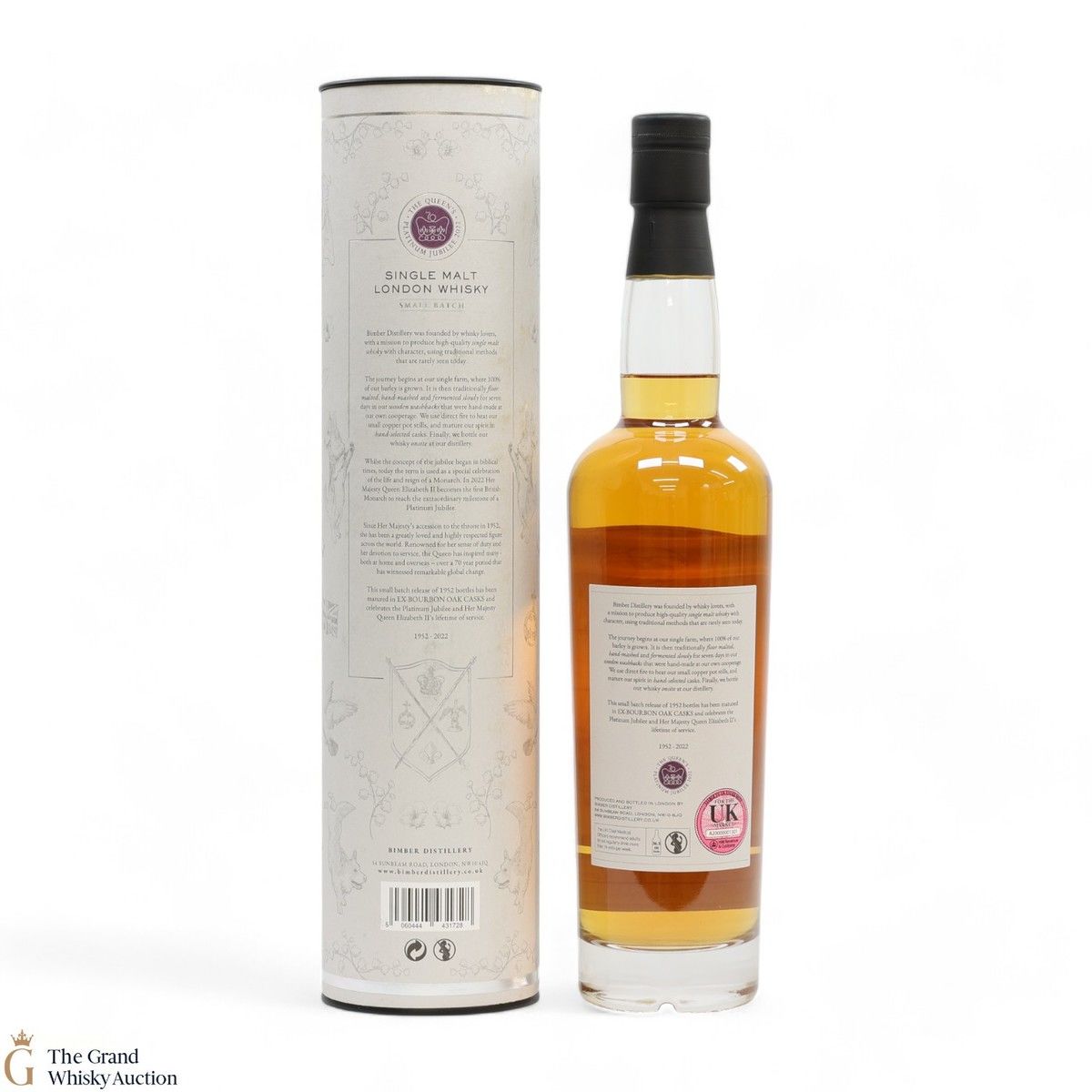 This Bimber limited edition small batch release celebrates the Platinum Jubilee of Queen Elizabeth II. Matured in ex-bourbon casks for four years before being bottled at a strength of 51.8% abv. One of 1,952 bottles.