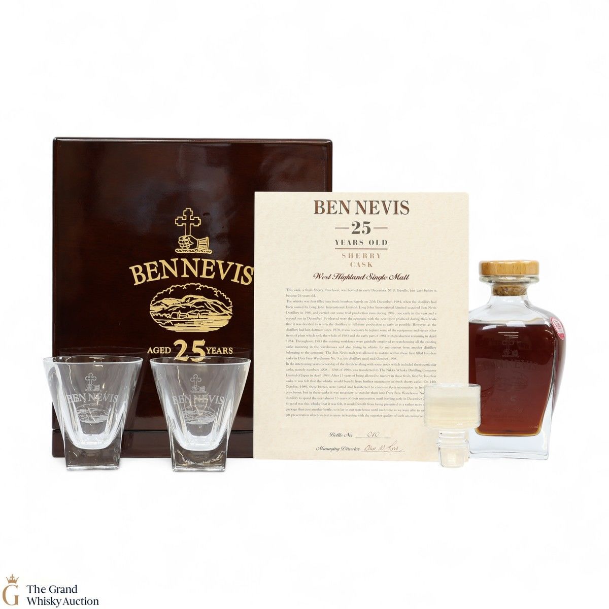 A gift set containing a bottle of 25-year-old Ben Nevis and a pair of glasses. Distilled in December 1984, it was aged initially in fresh bourbon barrels, before being transferred into fresh sherry puncheons until it was bottled in December 2010 just days before it because 26 years old.